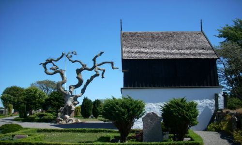 Pobudka, śniadanie i codzienny rytuał pakowania. W kilka minut jesteśmy na rowerowym szlaku. Jedziemy zachodnim wybrzeżem w kierunku Ronne. W 1/3 drogi napotykamy na największe na wyspie urwisko skalne. Patrząc na ten widok ciężko sobie wyobrazić, że po drugiej stronie wyspy są bezkresne piaszczyste plaże. Po mocno pofalowanym szlaku czeka nas teraz marszruta płaską, asfaltową nadmorską drogą lokalną. Teraz dopiero czujemy dawny, rybacki klimat wyspy. Dojeżdżamy .W tym miejscu zwiedzamy wędzarnie-muzeum. Obok jest bar z rybkami pod różnymi postaciami więc uzupełniamy zapas energii. Dalsza trasa prowadzi nas nudną ale komfortową ścieżką przez nadmorskie lasy. Docieramy do kolejnego kościoła obronnego. Zwiedzamy także wnętrze. Na zewnątrz napotykamy bardzo unikalny samozamykacz. Byliśmy, zaledwie w odległości 12 km od Ronne. Postanowiliśmy rozbić się na kolejnym tanim polu namiotowym. Miejsce na namioty było w bardzo malowniczym ogrodzie. Było tam miejsce na ognisko więc zrobiliśmy szybki wypad do Ronne na zakupy. Suta kolacja i toaleta w spartańskim zapleczu sanitarnym.