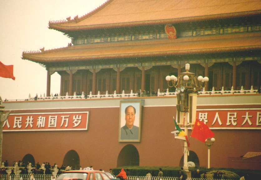 Duże wrażenie robi na nas plac Tiananmen. Jest on pięknie owietlony przez cała noc. Od strony północnej placu spogląda na nas z ogromnych rozmiarów portretu zawieszonego na Bramie Niebiańskiego Spokoju - Przewodniczący Mao. Mimo późnej godziny na placu jest mnóstwo ludzi - dzieci jeżdżące na deskorolkach, puszczające latawce i balony, grupki turystów, sprzedawcy pocztówek i papierowych chińskich flag.