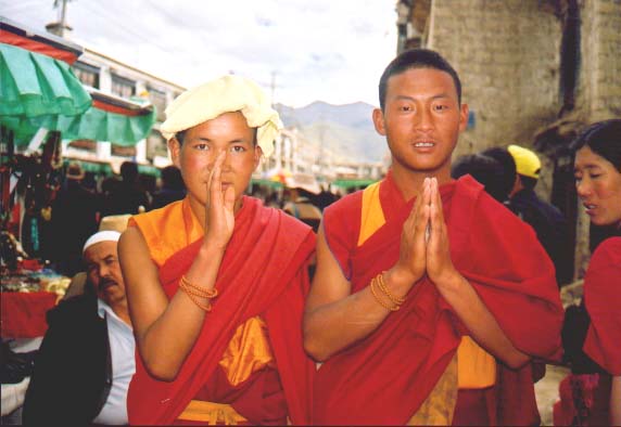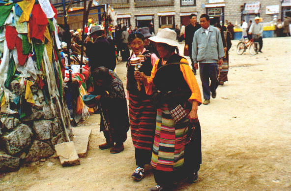 Ulicami ciągną grupy lub pojedynczy pielgrzymi w tradycyjnych strojach z nieodłącznym różańcem w ręce, obracający kołowrotki modlitewne, składający pokłony do samej ziemi. Robią to nawet na bardzo ruchliwych ulicach, zatrzymując w ten sposób ruch na kilka minut. Tybetanki w długich brązowych sukniach z barwnymi pasiastymi fartuchami, głowy mają owinięte kolorowymi wełnianymi szalami. W uszach i na szyi noszą ozdoby wykonane ze srebra i kamieni szlachetnych. Ich ręce zdobią ogromne ciężkie bransolety wykonane z dużych białych muszli oceanicznych. Kibić mają przepasaną pasem z piękną wykutą w srebrze klamrą. Mężczyźni włosy mają przewiązane czerwonymi lub czarnymi przepaskami. Niektórzy noszą na głowach niedbale nasunięte wełniane kapelusze. Uszy często udekorowane są kolczykami, a na szyjach mają zawieszone kamienne amulety - podłużne kamienie z białymi lub brązowymi wzorami. Do pasa noszą przypięty sztylet schowany w srebrnej bogato zdobionej pochwie. Tybetańczycy pielgrzymując do więtych miejsc składają głębokie pokłony, aż czołem dotkną ziemi.