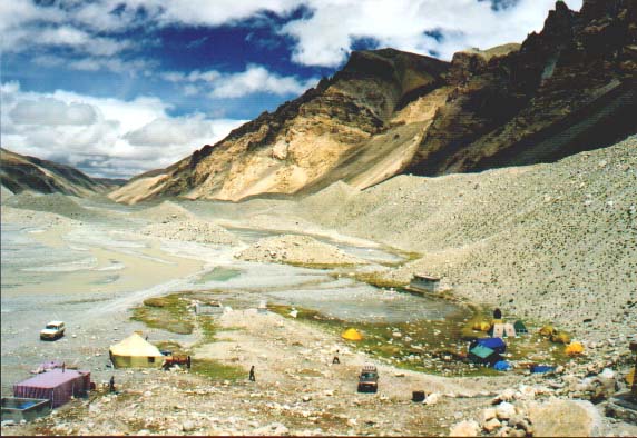 Było tam rozstawionych kilkanacie namiotów różnych wypraw, m. in. węgierskiej i niemieckiej. Stamtąd pieszo udalimy się jeszcze dalej, chodząc po kamiennych gołoborzach moreny lodowca Rinpoche. Dolina przypomina pustynie skalną - doć wąska wypełniona odłamkami skalnymi i kamieniami moreny lodowców Rongphu. Dominują różne odcienie szaroci i brązu mocno odcinające się od błękitu nieba. Z tego miejsca w oddali widać było dwa lodowce schodzące z gór. Lodowiec Rongphu poniżej szczytu Guangming (6533 m n.p.m.) i Wschodni Lodowiec Rongphuk na zboczach Changtse (7583 m n.p.m.). Spotkać można było pojedyncze rolinki - małe, trzymające się kurczowo swoimi korzeniami podłoża. Niektóre pięknie kwitły. Aż nie do wiary, że udało im się przetrwać w takich warunkach.