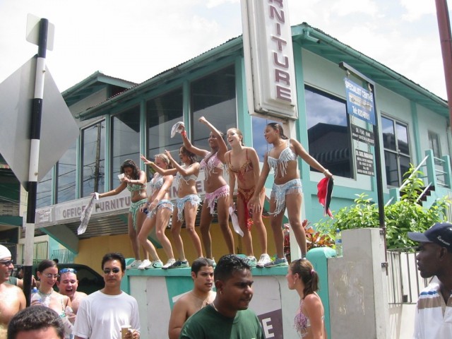 Karnawał na Trynidadzie trwa przez kilka dni na okr±gło i bawi± się wszyscy - mieszkańcy i tury¶ci dosłownie przez 24 godz./dobę. Jak kto¶ już nie ma siły - idzie się przespać na parę godzin i dalej się bawi. Tutaj amerykańskie turystki wlazły na murek i zagrzewały do zabawy przechodz±cych. Kto ma już dosyć zabawy - jedzie odsapn±ć na Tobago.