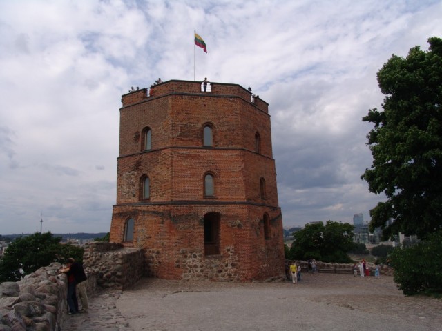 " Baszta Giedymina (lit. Gedimino pilies bokątas) – baszta zachodnia Zamku Górnego w Wilnie, który wzniesiono w stylu gotyckim na Górze Giedymina w 1409, za panowania Witolda. Zamek murowany, z trzema basztami, zast±pił drewnian± warownię, która istniała już w XIV wieku za panowania Giedymina. W roku 1419 zamek spłon±ł, lecz został odbudowany. Od czasów Aleksandra Jagiellończyka w Zamku Górnym mie¶ciła się ludwisarnia, a w lochach więzienie. Zygmunt II August odnowił zamek, w którym umie¶cił swoj± bibliotekę. W 1655 zamek zdobyli Rosjanie. Z biegiem czasu popadł w ruinę. Do naszych czasów zachowała się jedynie wieża, zwan± Baszt± Giedymina. W 1830 postawiono drewnian± nadbudówkę na telegraf optyczny na ocalałym zrębie baszty, któr± zdjęto w latach trzydziestych XX wieku. Wówczas polscy konserwatorzy zabezpieczyli wieżę w celu przeprowadzenia renowacji i w 1930 roku odtworzyli trzeci± kondygnację. W dniu 20 wrze¶nia 1939 roku Rosjanie zrzucili z wieży polsk± flagę i pozwolili 27 paĽdziernika wywiesić zamiast niej flagę litewsk±. Około godziny 11 w dniu 13 lipca 1944 roku po "Operacji Ostra Brama", w trakcie której wypędzono Niemców z Wilna, żołnierze AK pchor. Jerzy Jensz "Krepdeszyn" i kpr. Artur Rychter "Zan", zawiesili na wieży biało-czerwon± flagę, któr± jednak szybko usunęli nowi okupanci wywieszaj±c flagę czerwon±[1][2][3][4]. W trakcie działań wojennych czę¶ciowo zniszczona została najwyższa, trzecia, kondygnacja. W czasach Litewskiej SRR kolejny remont wieży przeprowadzono w latach 1948-1950. Od 1990 roku na szczycie wieży powiewa flaga Litwy." http://pl.wikipedia.org/wiki/Baszta_Giedymina