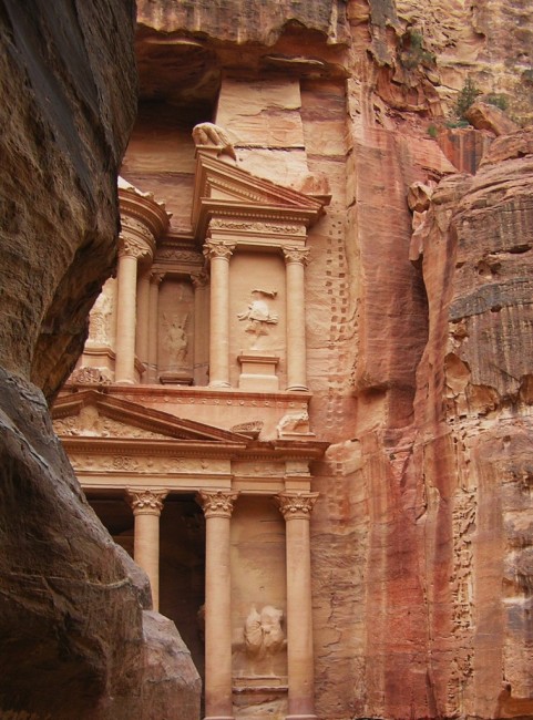 " Petra (z gr. πέτρα "petra", skała; arabski: البتراء, al-Bitrā) to obecnie ruiny miasta Nabatejczyków, znajduj±ce się w południowo-zachodniej Jordanii. Położona jest w skalnej dolinie, do której prowadzi jedna w±ska droga w¶ród skał – w±wóz As-Sik. Petra słynie z licznych budowli wykutych w skałach. W czasach antycznych, w okresie od III w. p.n.e. do I w. n.e., miasto przeżywało czasy swojej ¶wietno¶ci, będ±c stolic± królestwa Nabatejczyków. Sami Nabatejczycy zwali Petrę Rqm (Rakmu), co oznacza "wielobarwna"." http://pl.wikipedia.org/wiki/Petra_%28Jordania%29