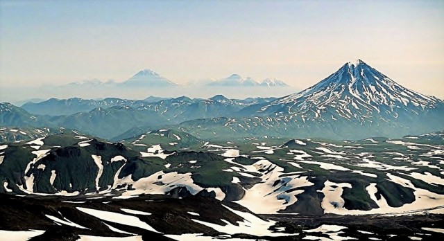 Przed chwila przeczytałem bardzo interesuj±cy artykuł na temat fotografii dalekich obserwacji. CYTAT " W lipcu padł rekord ¶wiata. Hiszpanie wykonali zdjęcie stoj±c w Pirenejach Francuskich na szczycie Pic de Canigou. Na fotografii uwiecznili Tetes de Chabriere i Puy de la Seche w Alpach Francuskich, które były od nich oddalone o 381 km." dalej "W Polsce dalekie obserwacje w teorii mog± wynie¶ć 260 km. Z Tarnicy w polskich Bieszczadach można dojrzeć wierzchołki gór rumuńskich. Nikomu jednak jeszcze nie udało się tego dokonać (potwierdzić). Obecnie naszym rekordem jest 240 km - obserwacja z czeskiego szczytu Pradziad polskich Tatr." Może mały konkursik na GLOBIE? Na tym zdjęciu odległo¶ć pomiędzy wulkanem Goriełyj na którym stoję, a Koriackim wynosi 95 km. Na zdjęciu widać dalsze obiekty, ale nie mam 100% pewno¶ci które to s±. Prawdopodobnie pomiędzy Koriackim i Awaczyńskim widać wulkan Zupanowski oddalony jeszcze o dodatkowe 30 km. Ale zabawa polega na tym, żeby potwierdzić ze 100% pewno¶ci± namierzony obiekt.