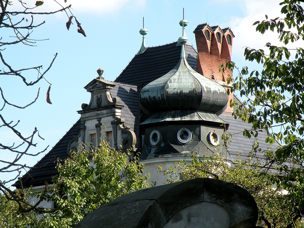 Widok na "kręcone"kominy z bramy zamku.