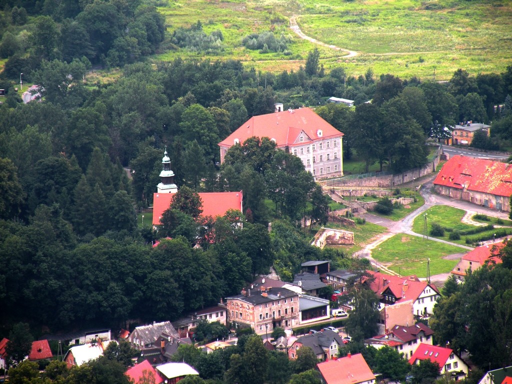 Widok z zamku Chojnik, na pałac w Sobieszewie