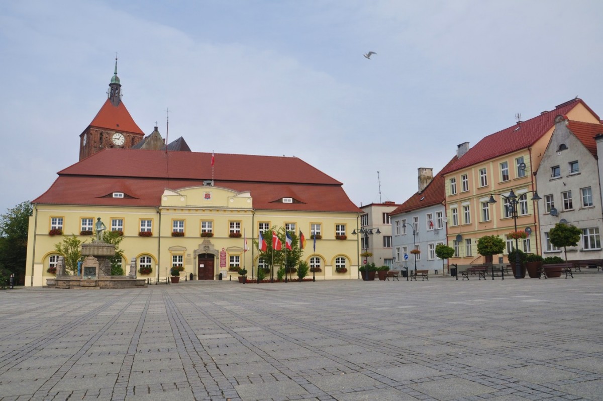 Darłowo, ratusz na rynku i kościół w tle