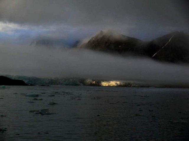 To jest zdjęcie przedstawiaj±ce pogodę. Mamy tutaj na raz, niebieskie niebo, mgłę, chmury poniżej stu metrów pułapu, błysk słońca i złom lodowy wypełniaj±cy Isbjornhamnę. Czarna skała po lewej to zarys Przyl±dka Baranowskiego, słynnego fotografa, który zgin±ł w tragicznym wypadku na King Georgu, wyspie na drugim krańcu ¶wiata.