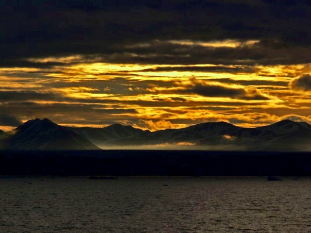 W Arktyce przez kilka miesięcy trwa wieczny dzień polarny. ¦wiatło jest bezpostaciowe, nie ma cieni, słońce kr±ży po nieboskłonie; w południe na południu, o północy na północy. Nawiasem zupełnym, jest w Tromso pomnik pięknej dziewczyny, do którego słońce dociera tylko latem, na chwilę około drugiej w nocy, Kiedy zbliża się jesień, około drugiej połowy sierpnia słońce zdaje się kr±żyć tuż nad widnokręgiem, daje to całodobowy spektakl złotej godziny, w której przestrzeń zda się być przesycona czerwieni±, krajobraz staje się plastyczny, na wierzch wychodz± wszystkie szczeliny i załamania. Tutaj słońce ¶wieci zza kadru, nisko nad horyzontem, za górami. Zabarwia niebo na pomarańczowo i czarn± krech± odcina nieo¶wietlone elementy krajobrazu, tutaj wysok± na kilkadziesi±t metrów granitow± przegrodę półwyspu Treskellen, odzielaj±cego od siebie dwa akweny w fiordzie Hornsund, Burgerbuchtę, sk±d zrobiono fotografię, od Brepolen, rozległej zatoki zamkniętej od północy lodowcem Horn.
