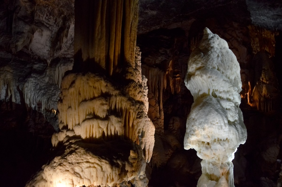 - On (Filarowa Kolumna) z plemienia stalagnat – potężny i gorący aż pomarańczowy, ona (Brylant) z plemienia stalagmit – drobna (5 m wysokości), zimna i biała jak śnieg. Oboje dumnie stoją i witają swych gości w Sali Zimowej.