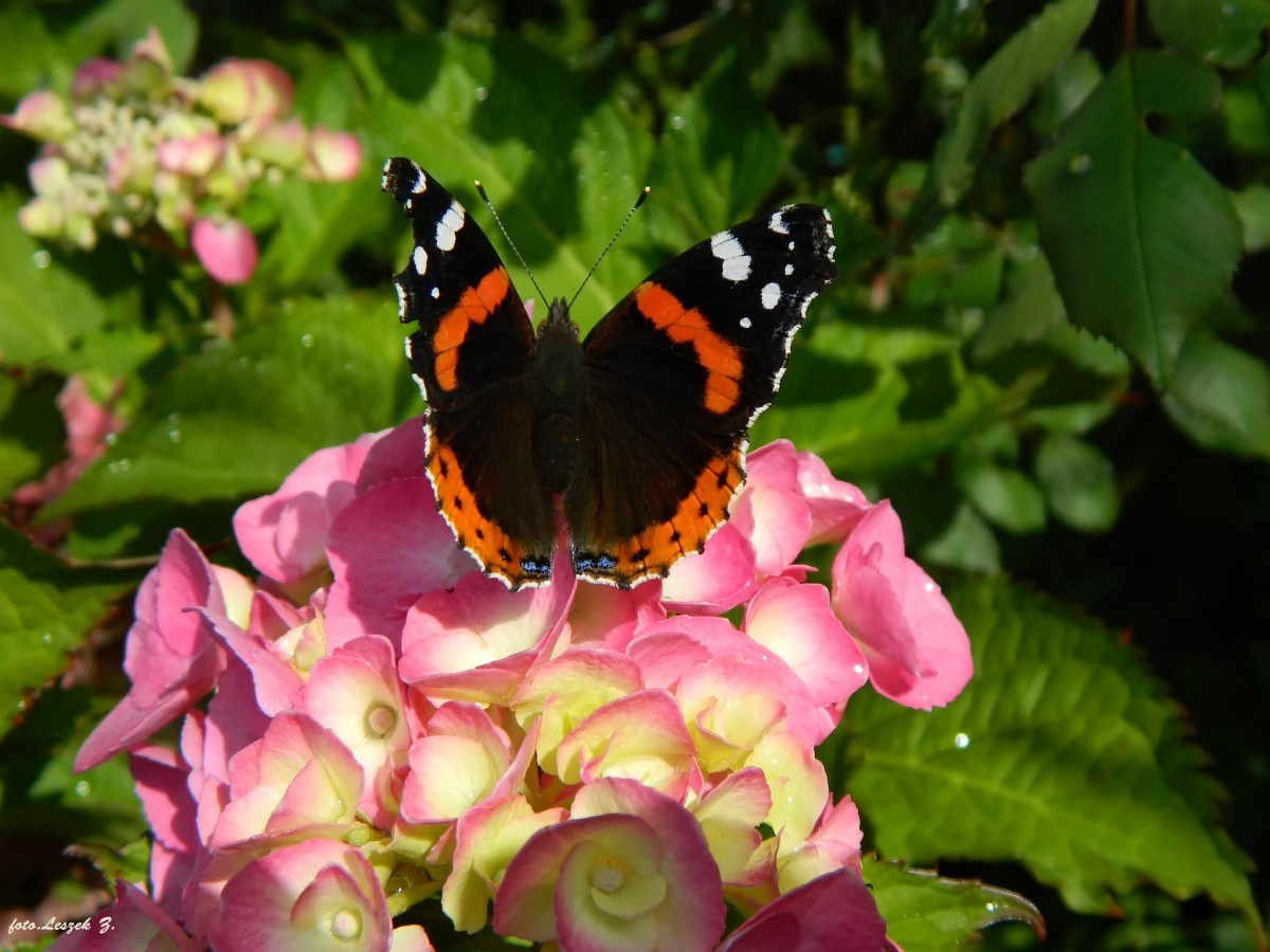 Foto-informacje:Rusałka admirał (Vanessa atalanta) to dzienny motyl o ciemnym ubarwieniu ciała i skrzydeł. Na skrzydłach pierwszej pary znajdują się pomarańczowe przepaski i białe plamy. Skrzydła drugiej pary kończą się pomarańczową przepaską z małymi czarnymi kropk