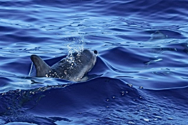 Igraszki delfinów, ku uciesze pasażerów towarzysz± łodziom wracaj±cym z wyspy Corvo na wyspę Flores